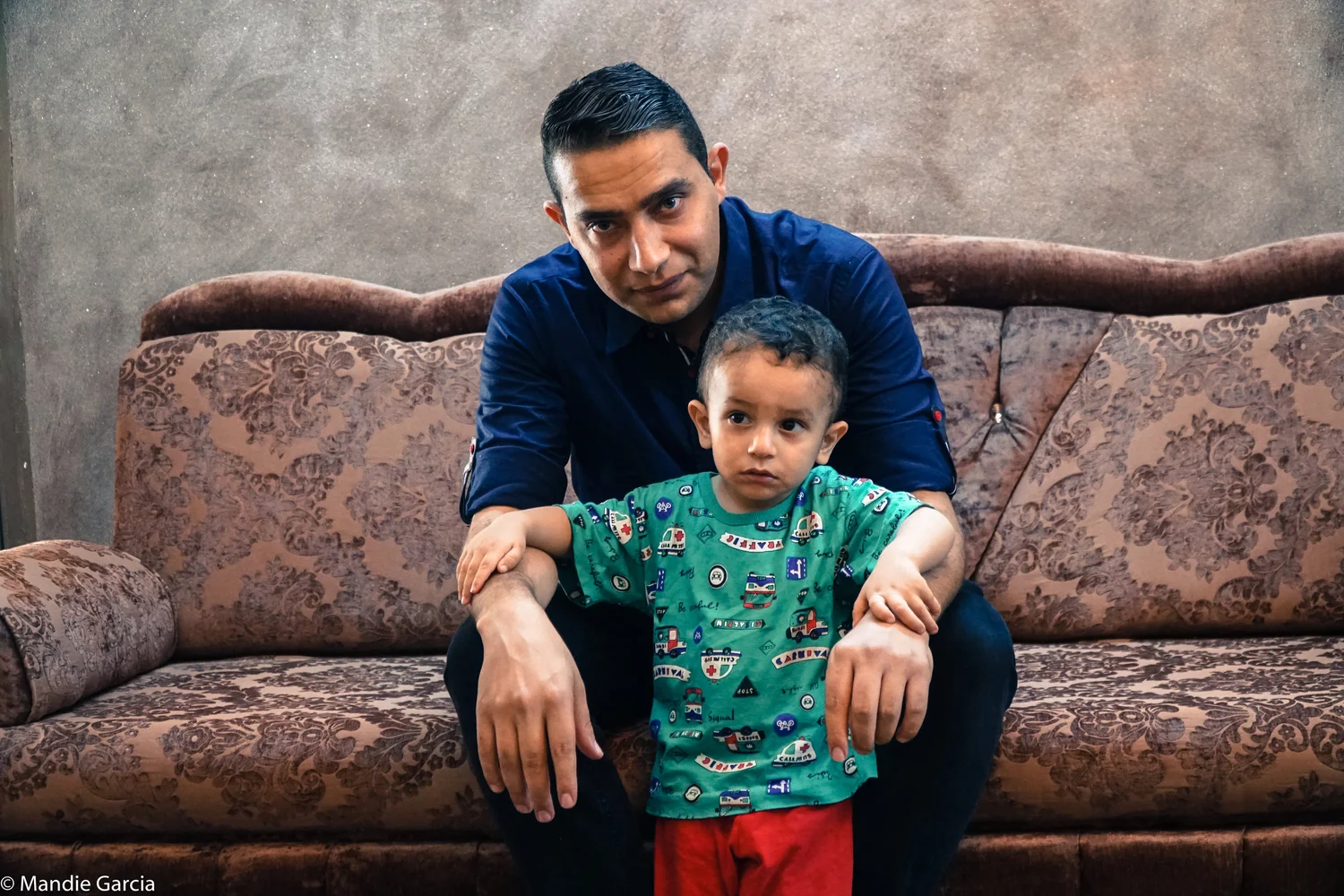 A Bedouin humanitarian worker and his child sit in their home near the Syrian border in Mafraq, Jordan