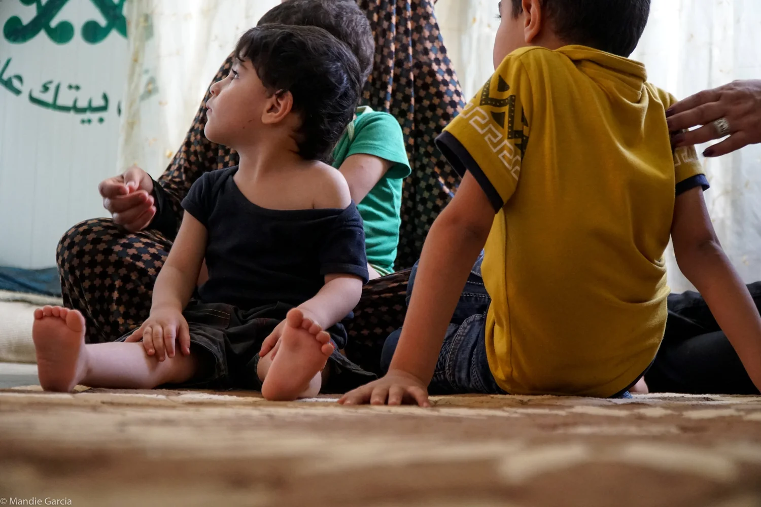 Ahmed’s twin brother, Mohammed, stands between their mother and the curtain hanging from their makeshift window.